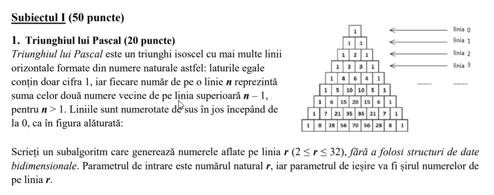 Desigur putem să rezolvăm problema mai literal, deoarece știm că valorile numerelor din triunghiul lui Pascal reprezintă , linie și poziție începând de la 0.