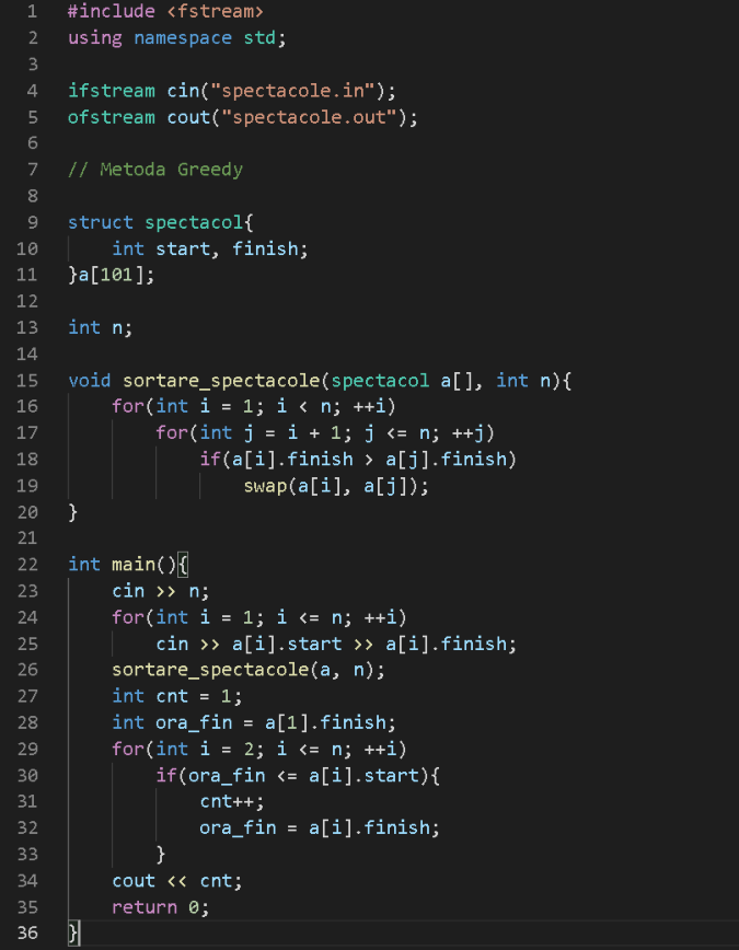 • Verificăm dacă ora de început a următorului spectacol din vector este >= ca ora de final a spectacolului la care “suntem”