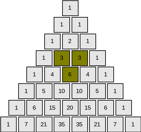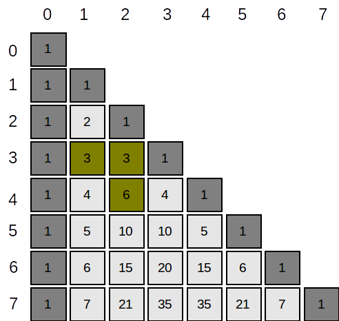 tp[i][j]punem suma dintre valoarea direct de deasupratp[i-1][j], și cea din stânga celei de sustp[i-1][j-1](tp[i][j] = tp[i-1][j-1] + tp[i-1][j]) În această rezolvare stocăm foarte multe date care nu sunt necesare, deși nu folosim decât linia anterioară, avem o complexitate de spațiu